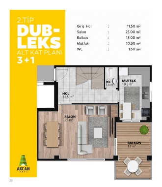 2.TİP DUB- Giriş Hol : 25.00 m 2 11.50 m Salon : 2 LEKS Balkon : 13.00 m 2 10.30 m 2 : Mutfak ALT KAT PLANI WC : 1.60 m 2 3+1 28