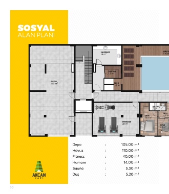 SOSYAL ALAN PLANI Depo : 105.00 m 2 Havuz : 110.00 m 2 Fitness : 40.00 m 2 Hamam : 14.00 m 2 Sauna : 5.30 m 2 Duş : 5.20 m 2 30