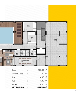 Depo : 105.00 m 2 Toplantı Odası : 22.00 m 2 Duş : 14.00 m 2 Duş : 11.00 m 2 WC x2 : 8.00 m 2 NET TOPLAM : 439.50 m 2 31